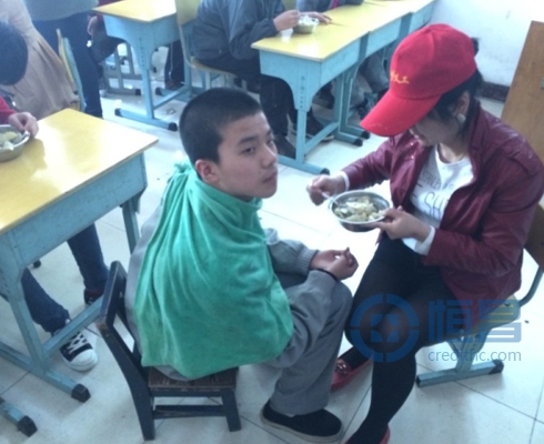 志愿者捧上一碗餃子,打算喂一個叫冰冰的9歲自閉癥小男孩。中心老師連忙說:“我們來吧,這孩子吃飯最難了,每次要喂一個小時,平時你們都很累,今天休息一下吧!”黃欣對楊老師說:“放心吧,我和記者姐姐一起喂冰冰。”在冰冰的不配合下,志愿者花了大約40分鐘喂冰冰吃了10個餃子。