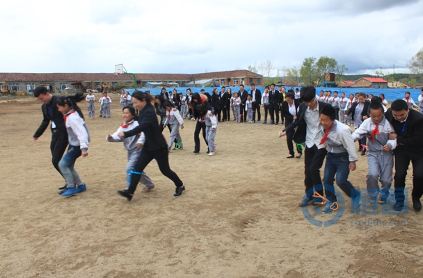 到達目的地后,志愿者和學校相關負責人首先進行了捐贈儀式。在西橋小學全體師生的列隊歡迎下,恒昌志愿者看到了單純、可愛的孩子們感受到孩子最淳樸的快樂。恒昌志愿者將帶來的書包,文具,籃球、足球、跳繩、羽毛球等用品分別發給全校113名小學生手上, 鼓勵孩子們從小樹立遠大的志向和崇高的理想信念,好好學習,天天向上,在老師們的精心培養和教育下,成長為國家的棟梁之才,將來為國家做出應有的貢獻。儀式過后恒昌志愿者和學生們一起玩“兩人三足”的游戲,在游戲過程中增進了我們與孩子之間的友誼,孩子們在學習之余得到了運動和鍛煉。