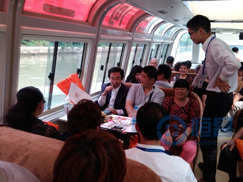 大約二點半大家來到渡頭,開始活動的第二個流程,坐船游覽“三河三園”美景,在近一個小時的游船過程中,除了品茗、吃水果和點心,并加入了有獎問答環節,客戶也是積極參與,還有客戶表演了戲曲聯唱,將活動的氣氛推上了最高潮。