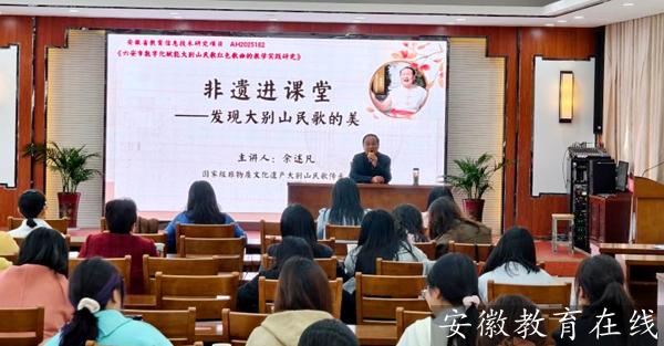 下午的專題講座,國家級大別山民歌傳承人余述凡以《非遺進(jìn)課堂——發(fā)現(xiàn)大別山民歌的美》為題,將原生態(tài)演唱與曲調(diào)解析深度融合,讓老師們親身感受到了本土音樂的文化密碼,為民歌教學(xué)從“教唱”到“傳神”提供了切實(shí)可行的路徑。六安市教研員朱凌則以《感受美、鑒賞美、表達(dá)美和創(chuàng)造美》為題,將音樂的理論高度與教學(xué)實(shí)踐緊密結(jié)合。她引導(dǎo)教師從教育家精神的視角重新審視日常課堂,激發(fā)了與會教師對美育使命的深層思考,實(shí)現(xiàn)了從教學(xué)技術(shù)到教育哲學(xué)的升華。